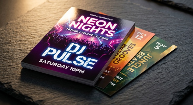 Premium UV coated printing for clubs, events, menus, mailers, and high-impact promotions.